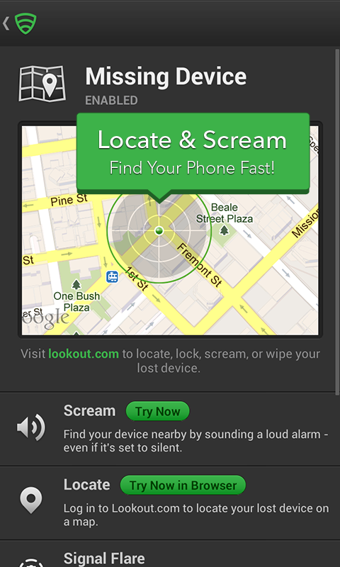 • Locate & Scream: Map the location of your device and make it sound an alarm - even when it is on silent!