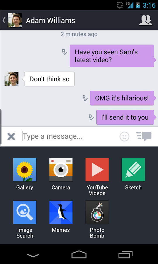 And now you can do even more on Kik Messenger For Android, with new features that let you instantly find and share fun videos, sketches and pictures.